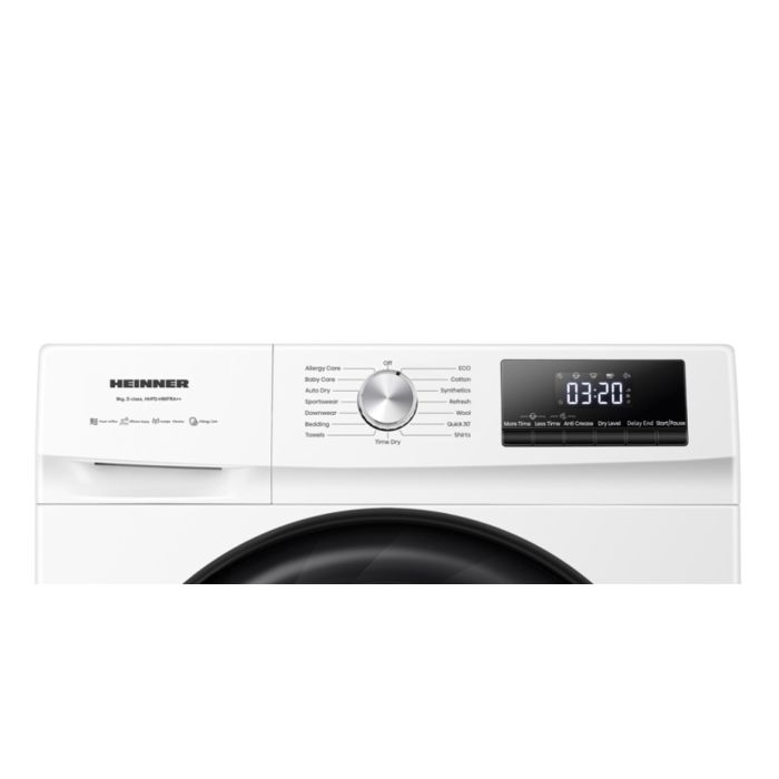 SUŠILICA RUBLJA S TOPLINSKOM PUMPOM HEINNER HHPD-H90FRA++, KAPACITET PUNJENJA 9 KG, ENERGETSKA KLASA D, 15 PROGRAMA SUŠENJA, LED ZASLON, ZAŠTITA OD ALERGIJA, BRZI PROGRAM 30 MIN, PROGRAM ZA NJEGU BEBA, FUNKCIJA ODGOĐENOG POČETKA, FUNKCIJA PROTIV NABORA, SVJETLO U BUBNJU, PODRŠKA ZA FLEXRACK, ODABIR STUPNJA SUŠENJA, INDIKATOR ČIŠĆENJA FILTRA ZA KAMENAC, INDIKATOR PUNOG SPREMNIKA ZA VODU, ZAŠTITA ZA DJECU, DIMENZIJE (ŠXV): 59,5X61,0X84,5 CM, BOJA: BIJELA