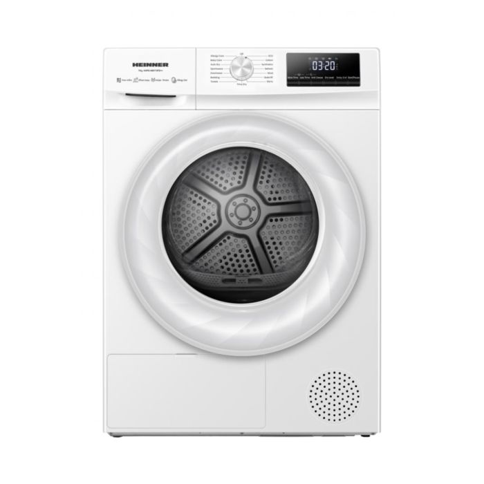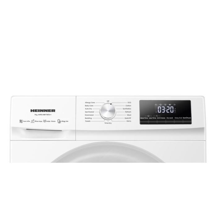 HEINNER SUŠILICA RUBLJA S TOPLINSKOM PUMPOM HHPD-HMY70FD++, KAPACITET PUNJENJA 7 KG, ENERGETSKA KLASA D, DIGITALNI ZASLON, SVJETLO U BUBNJU, 15 PROGRAMA, PROGRAM ZA VUNU, ECO PROGRAM, FUNKCIJA PROTIV NABORA, ODABIR STUPNJA SUŠENJA, ZAŠTITA ZA DJECU, POKAZATELJ ČIŠĆENJA FILTRA ZA DLAČICE, POKAZATELJ PUNOG SPREMNIKA ZA VODU, DIMENZIJE (ŠxDxV): 59,5x58x84,5, BOJA: BIJELA