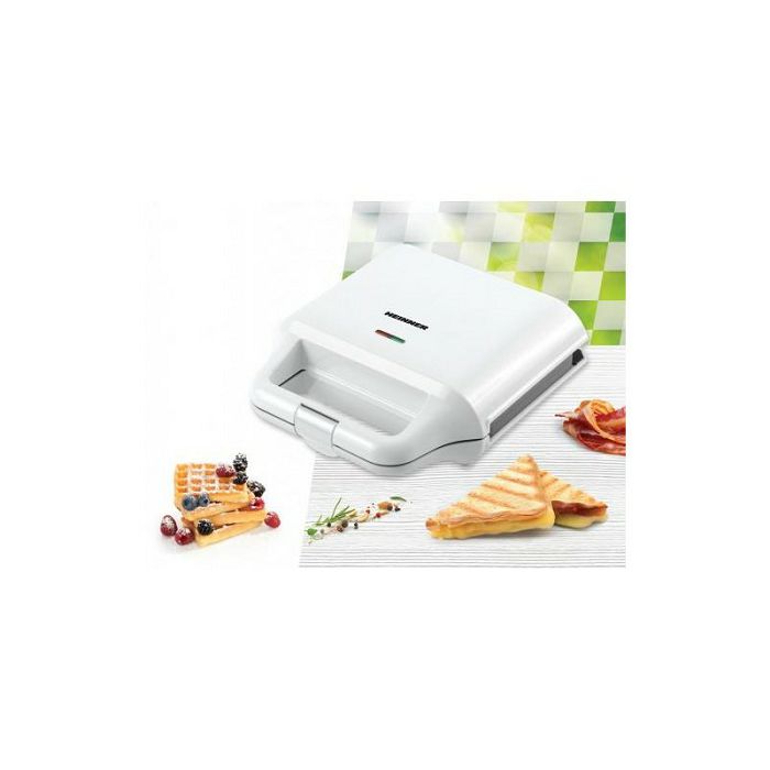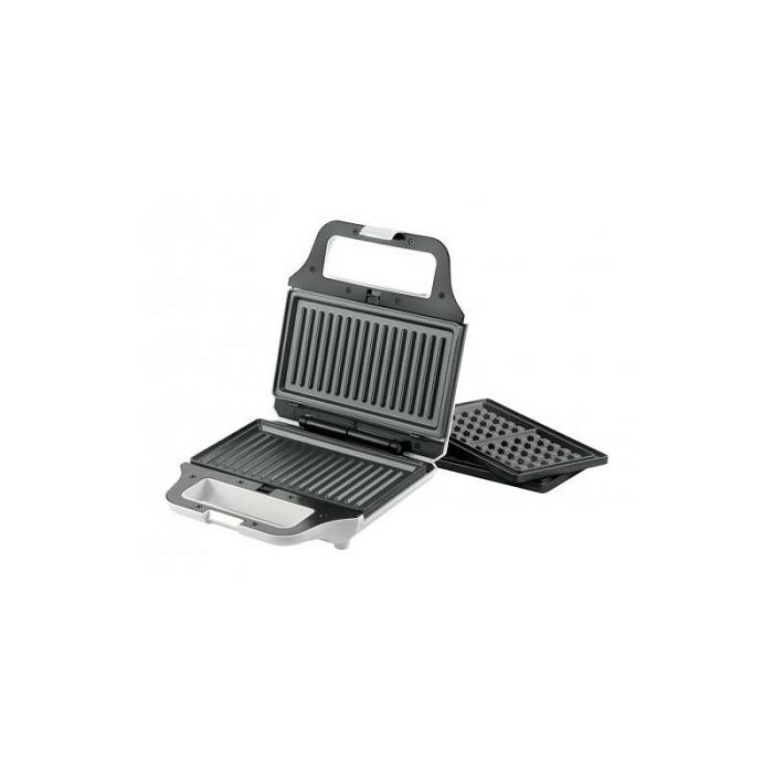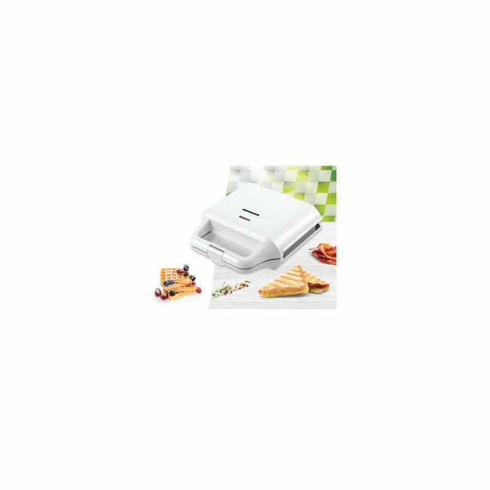 Odvojive pločice sa neljepljivim premazom 2 vrste pločica: roštilj i vafel Karakteristike Kapacitet: 2 sendviča Svjetlo "Spremno za upotrebu" Svjetlo indikatora napajanja Dimenzije ploče: 22,3 x 12,5 cm Snaga: 700W Dizajn u mat bijelom materijalu