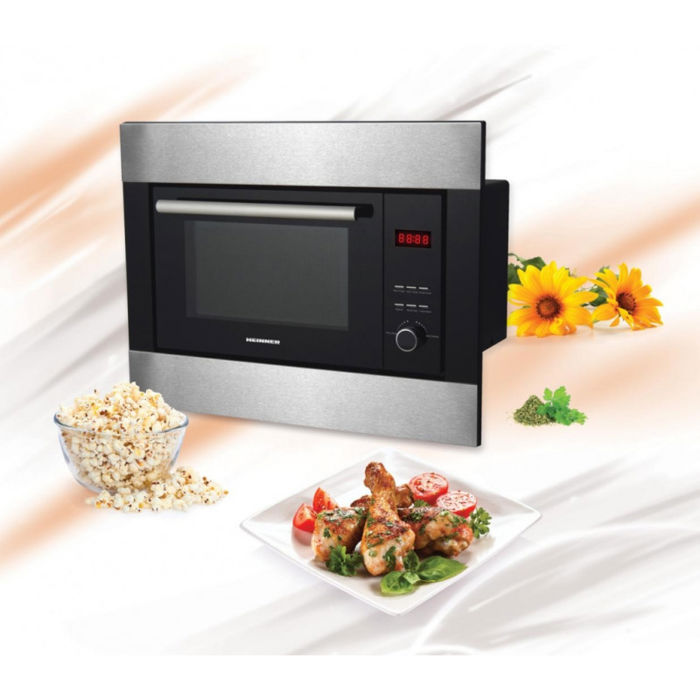 Ugradbena mikrovalna pećnica Heinner HMW-23BIXBK, kapacitet 23L, digitalno upravljanje, LED zaslon, snaga pećnice 800W, snaga roštilja 1000W, 5 koraka snage, 8 automatskih programa kuhanja, tajmer, maksimalno vrijeme kuhanja 60 min, funkcija odmrzavanja, zvučni signal na kraju programa, dječja pristupna brava, rotirajuća ploča promjera 270 mm, vertikalna vrata za otvaranje, dimenzije: 59,4x35,7x49,5 cm, Boja: Crno-nehrđajući čelik