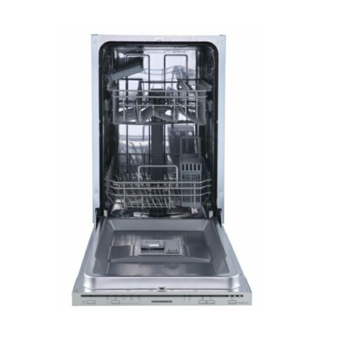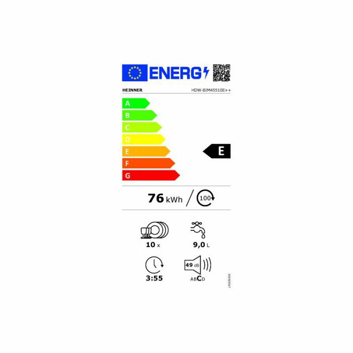 Heinner HDW-BIM45510E++ ugradbena perilica posuđa, 10 mjesta za pranje, energetska klasa E, elektroničko upravljanje, 5 programa pranja, brzi program od 30', intenzivni program od 90 min., program intenzivnog pranja na 65°C, programabilni početak (3/6/9H), opcija pola punjenja, dodatna funkcija sušenja, gornja košara s podesivom visinom (kada je prazna), donja košara: 2 sklopiva držača za tanjure, zaštita od poplave - Aquastop, potrošnja vode: 9L/ciklus pranja, dimenzije (ŠxVxD): 45 x 55 x 82 cm