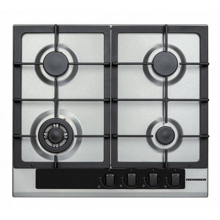 Ugradbena ploča za kuhanje Heinner HBH-V4IWFFCIX 4 plinska plamenika Wok plamenik nosač tave od lijevanog željeza Prednja kontrola Paljenje na dodir Sigurnosni uređaj za kvar plamena Uključene mlaznice rezervnog UNP-a Dimenzije (ŠxD): 59x52 cm Boja: Nehrđajući čelik