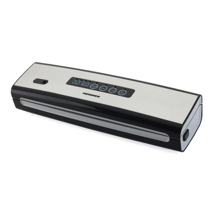 Heinner HAV-130BKSS vakuum i brtvljenje, vakuum i brtva, suhi i mokri vakuum, funkcija brtvljenja, vakuum ladice, kontrola dodira, funkcija pulsa, dva načina: normalan / osjetljiv, rola vrećice uključena 20x200 cm, ladice za vakuumsko crijevo, ugrađeni mini rezač, kompatibilan s vrećicama širine 30 cm, vakuumski kapacitet: 6L / min, tlak: 0,58bar, snaga: 130W, kompaktan dizajn za jednostavno skladištenje, Gornje kućište od nehrđajućeg čelika