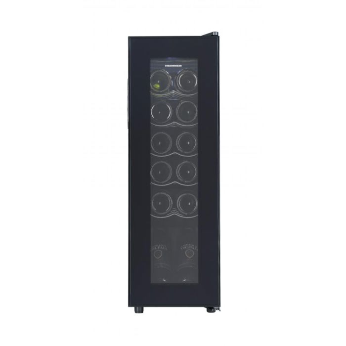 Heinner HRV-A45DRM12 hladnjak za vino, energetska klasa: G, ukupni kapacitet: 45L, kapacitet punjenja: 12 boca (750ml), jedna temperaturna zona, raspon temperature: 5~20°C, LED zaslon, elektroničko upravljanje, LED svjetlo, 5 kromiranih metalnih polica, dječja brava, vrata s mogućnošću otvaranja i zatvaranja, dimenzije (ŠxVxD): 27 x 49 x 84 cm, boja: crna