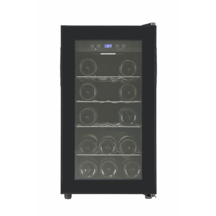 Heinner HRV-A52DRM18 hladnjak za vino, energetska klasa: G, ukupni kapacitet: 55L, kapacitet punjenja: 18 boca (750ml), jedna temperaturna zona, raspon temperature: 5~20°C, LED zaslon, elektroničko upravljanje, LED svjetlo, 4 kromirane metalne police, dječja brava, dimenzije (ŠxVxD): 36 x 57,5 x 67 cm, boja: Crna