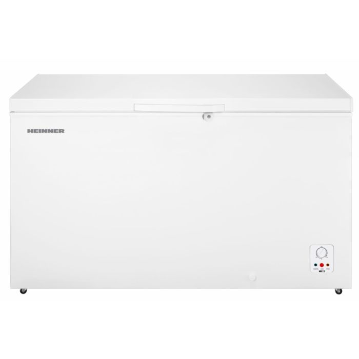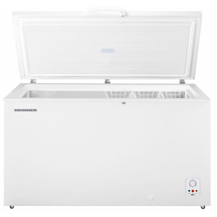 Heinner HCF-HS420E++, ukupni kapacitet: 420L, energetska klasa: E, Inverter kompresor, mehaničko upravljanje s podesivim termostatom, LED svjetlo, 3 žičane košare, ručka koja se može zaključati, kotačići za jednostavan transport, ručno odmrzavanje, kapacitet zamrzavanja: 19,0 kg/24 h, dimenzije (ŠxDxV): 144,8 x 72,1 x 85,2 cm, boja: Bijela