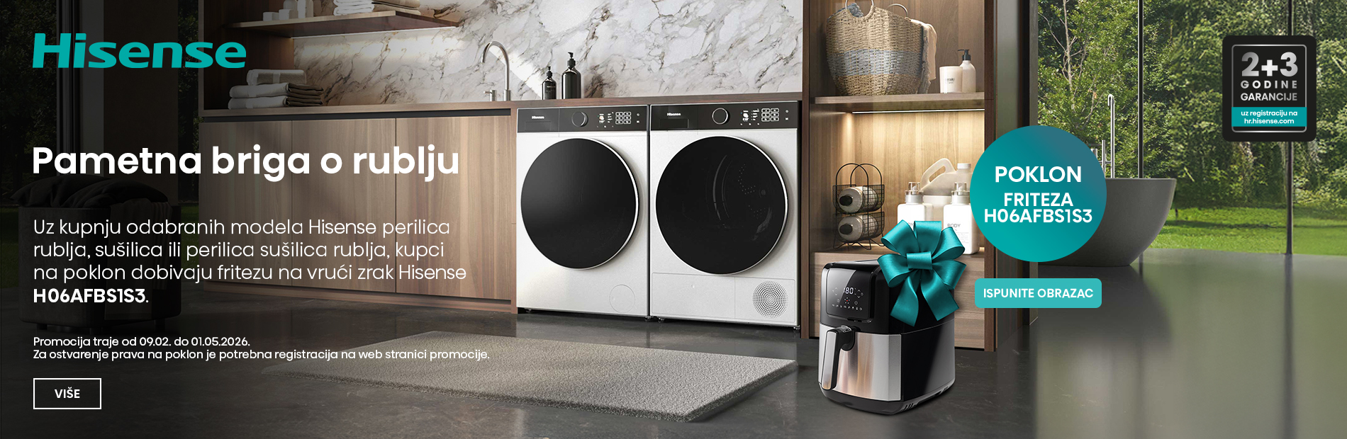 Uz kupnju odabranih modela Hisense perilica rublja, sušilica i perilica-sušilica, nakon prijave putem obrasca na poklon stiže Hisense friteza na vrući zrak HO6AFBS1S3.