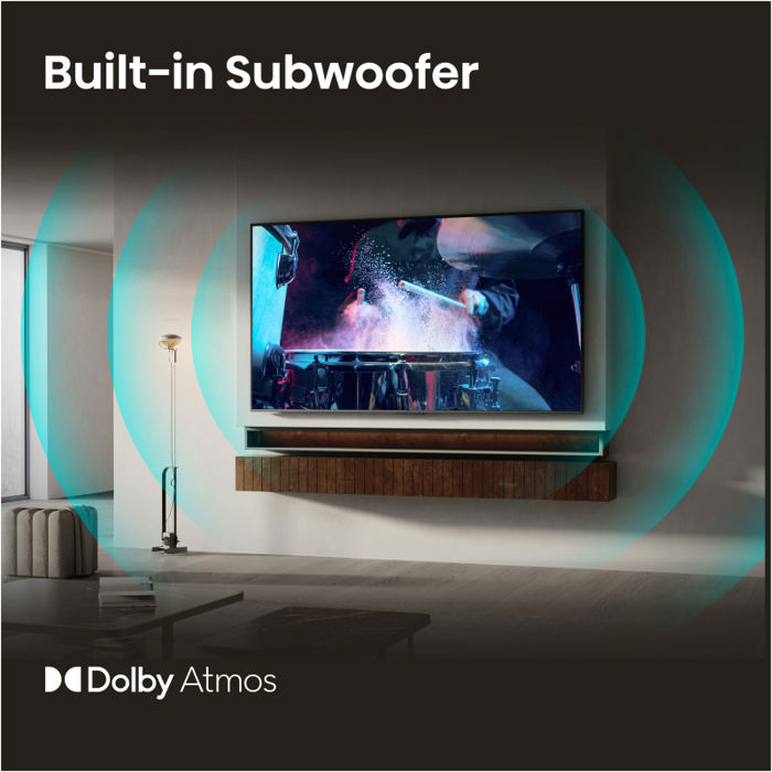 Osjetite snagu svake eksplozije i ritam svakog zvučnog zapisa - bez ikakve dodatne opreme. Ugrađeni subwoofer pruža dubok, snažan bas izravno s vašeg televizora, dodajući kinematografsku težinu i punoću vašem zvuku. Rezultat je impresivnije, kinematografsko zvučno iskustvo koje donosi energiju velikog ekrana u filmove, sport i igre.