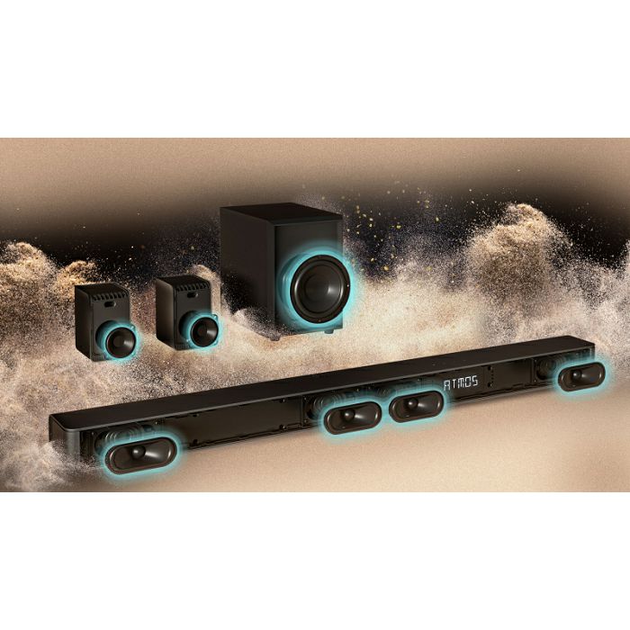 DOBLI ATMOS, DTS:X Filmsko iskustvo Zvuk je posvuda. Ako želite stvarno doživjeti zvuk, to ne možete postići samo s prednjim zvučnicima. Uz ovaj Hisense Sounbar, zvukovi dolaze iz svih smjerova kako bi vas okružili na najbolji mogući način i uronili u akciju.