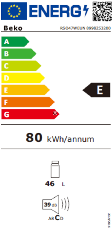 Beko RSO47WEUN Mini bar Energetska klasa: E Zapremina: 46 l Razina buke (dbA): 39 dBA Dimenzije VxŠxD: 49,6x47x44,7 cm Težina (kg): 14 Boja: bijela