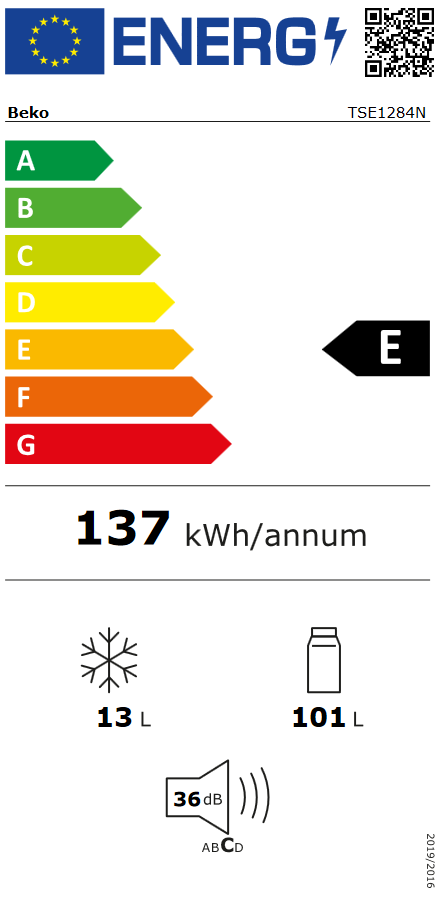 Ukupna zapremina (l): 114 Ukupna zapremina odjeljka za svježu hranu i rashlađivanje (l): 101 Staklene police visoke izdržljivosti Odjeljak za povrće Kapacitet odjeljka za jaja: 6 Promjena smjera postavljanja vrata LED osvjetljenje Mehaničke kontrole Samostojeći Boja: bijela Klasa energetske efikasnosti: E Godišnja potrošnja električne energije (kWh/godišnje): 137 Dnevna potrošnja električne energije (kWh/dnevno): 0.376 Dnevna potrošnja pri temperaturi 32°C (kWh/dnevno): 0.571 Nivo buke (dBA): 36 dBA Klimatska klasa: T Vrijeme čuvanja temperature hrane pri nestanku struje (sati): 9 Ukupna zapremina odjeljka za svježu hranu i rashlađivanje (l): 101 Ukupna zapremina zamrzivača (l): 13 Dnevni kapacitet zamrzavanja (kg/dan): 2 Klasa emisije zvuka: C Maksimalna sobna temperatura neophodna za zadovoljavajući rad (°C): 43 Visina: 84 cm Širina: 54 cm Dubina: 59 cm Težina: 28.5 kg