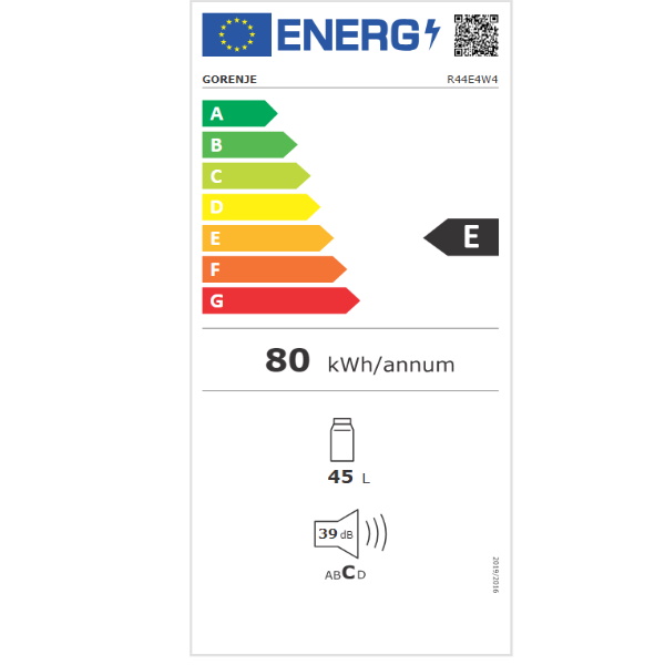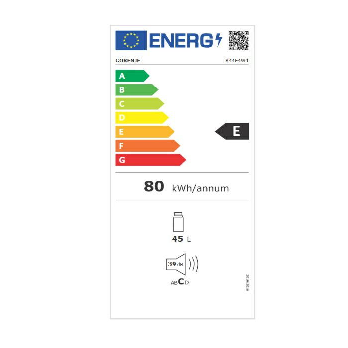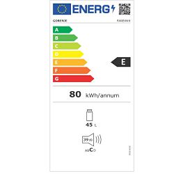 Tip konstrukcije Samostojeća Energetski razred E Energetski razred buke C Boja aparata Bijela Boja vrata Bijela Materijal vrata Lakirana Broj vrata 1 Vrsta baze 2 fiksne noge/ 2 podesive noge Broj zvjezdica Svježa hrana Klimatski razredi Subnormalna Normalna Subtropska Tropska Učinkovitost Ukupni volumen 45 l Obujam rashladnog dijela 45 l Procijenjena godišnja potrošnja električne energije 80 kWh Upravljanje Tip zaslona Nema Vrsta upravljanja Mehaničko Indikator za otvorena vrata Bez alarma i glasovnih poruka Namjestiva temperatura u zamrzivaču Ne Odleđivanje rashladnog dijela Ručno Karakteristike Bravica na vratima Ne Memoriranje u slučaju nestanka struje Ne Štedljivi program EcoMode Ne Oprema rashladnog dijela Police na vratima hladnjaka 1 posuda u vratima Ventilator za hlađenje Ne Osvjetljenje unutrašnjosti rashladnog dijela No illumination Broj staklenih polica u rashladnom dijelu 1 kom Podrum (0 zona) FreshZone ladica Oprema zamrzivačkog dijela Posudica za led Ne Posudice za led Ne Tehnički podaci Razina buke (max.) 39 dB(A) Broj kompresora 1 kompresor Rashladna tekućina R600a Polaganje aparata Dopušteno Skriveni kondenzator Ne Broj neovisnih rashladnih sustava 1 Širina proizvoda 445 mm Visina proizvoda 500 mm Dubina proizvoda 468 mm Bruto težina proizvoda 15 kg Neto težina proizvoda 14 kg Širina zapakiranog proizvoda 468 mm Visina zapakiranog proizvoda 533 mm Dubina zapakiranog proizvoda 488 mm Priključni napon 220-240 V Frekvencija 50 Hz Priključna snaga 60 W