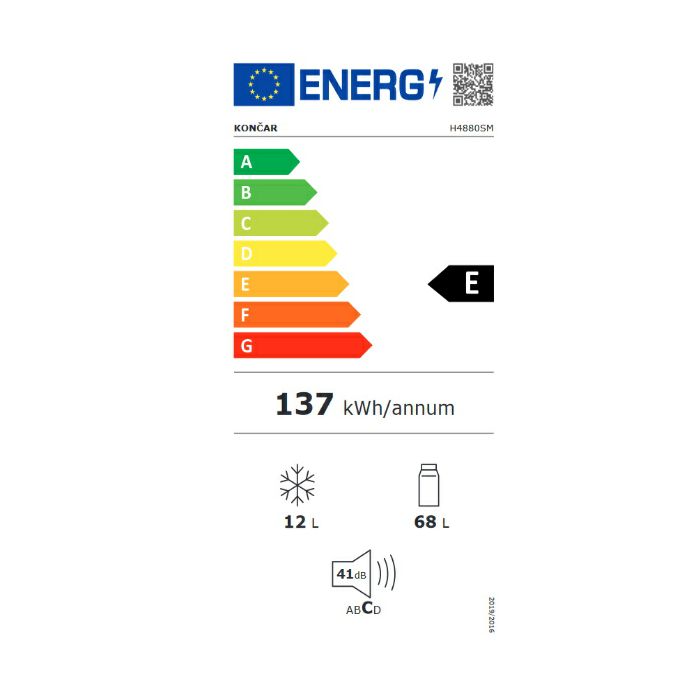 Opis Boja: Inox Broj artikla: TAEF00 EAN 13: 3858884338743 MJERE Ukupni korisni volumen: 80 l Visina/ Širina/ Dubina: 84,5/47,5/44,5 cm OPREMLJENOST Odleđivanje prostora za hlađenje: ručno Odleđivanje prostora za zaleđivanje: ručno Reguliranje temperature: + Osvjetljenje unutarnjeg prostora: + Staklene police u hladnjaku: 2 Žičane police u hladnjaku: – Žičane police u prostoru za zaleđivanje: – Ladice u ledenici: – Posuda za povrće: 1 Dodatni držač za boce: – Posuda za kocke leda: – Lopatica za led: – Nogice za niveliranje: + Promjenjiv smjer otvaranja vrata: + OSTALO Rashladno sredstvo: R600a Količina rashladnog sredstva: 0,024 kg Kapacitet zaleđivanja: – Klimatska klasa: N/ST Broj kompresora: 1 PRIKLJUČAK Napon: 220-240 V~ Ukupna priključna snaga: – Struja: 0,6A ENERGETSKA UČINKOVITOST Razred energetske učinkovitosti: E Potrošnja energije kWh/god: 137 Neto smještajni obujam volumen odjeljka za svježe namirnice (5°C): 68 l Neto smještajni obujam volumen odjeljka za zaleđene namirnice: 12 l Broj zvjezdica: 4 Vrijeme porasta temperature: – Razina buke: 41 dB Potrošnja energije kWh/24h: 0,59 PAKIRANJE Dimenzije zapakiranog proizvoda: 86,5/49/46 cm Masa aparata neto/bruto: 21/23,2 kg
