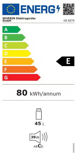 Severin KB 8879 Mini hladnjak Energetska klasa: E Kapacitet: 45 litara Hladni odjeljak Godišnja potrošnja: 80 kW Dimenzije (visina x širina x dubina): 50 x 44,5 x 46,8 cm Težina: 14 kg Boja: crna