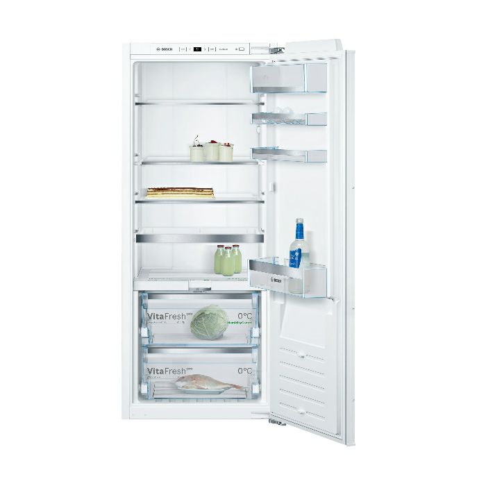Bosch KIF51AFE0 Ugradbeni hladnjak LED osvjetljenje Elektronička regulacija temperature s digitalnim prikazom FreshSense - konstanta temperatura zahvaljujući tehnologiji inteligentnog senzora Automatsko odmrzavanje hladnjaka Super hlađenje Akustički signal upozorenja kod otvorenih vrata Prostor za hlađenje: 222 l Br. površina za odlaganje od sigurnosnog stakla: 5 (podesive po visini: 4), od toga 1 VarioShelf djeljiva staklena polica Br. velikih površina za odlaganje na vratima: 4, od toga 1 ladica za maslac / sir Zona na oko 0°C, ukupni volumen od 59 l VitaFresh pro 0°C ladica s podešavanjem vlažnosti - voće i povrće ostaju 3x duže svježi VitaFresh pro 0°C ladica - ribe i meso čuva svježim do 3x duže Dimenzije (V x Š x D): 140 x 56 x 55 cm Ugradbene dimenzije (V x Š x D): 140 x 56 x 55 cm Država porijekla: Njemačka