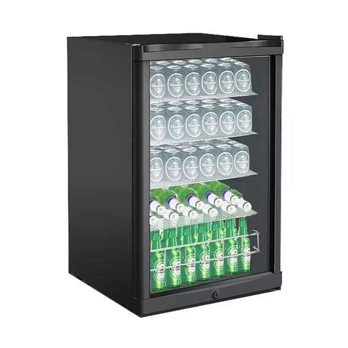 Cavin SC130-B Hladnjak za pivu i sokove Serija Polar Collection Crni okvir vrata Kompresorsko hlađenje UV zaštitno staklo Automatsko odmrzavanje Bijelo LED unutarnje svjetlo Bravica sa ključem Mehaničke kontrole Kapacitet: 115 l 1 zona (0-10 °C) Širina: 54 cm Visina: 84,5 cm Dubina: 55 cm Energetska i klimatska klasa: G, ST Potrošnja: 145 kWh/god Težina: 35 kg Razina buke: 39 dB