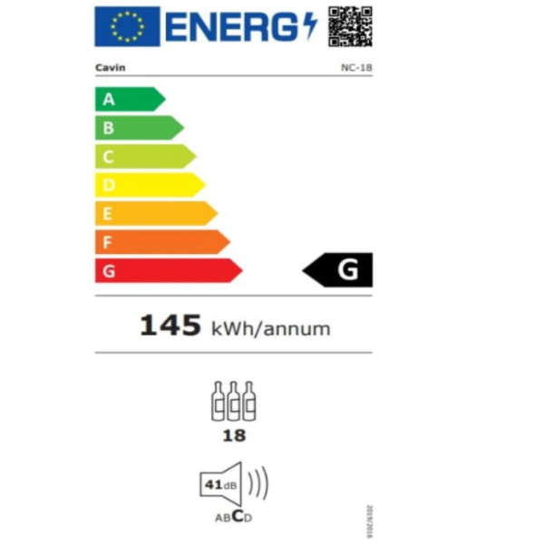 Cavin NC-18B Hladnjak za vino iz serije Northern Collection Crni okvir vrata Kompresorsko hlađenje UV zaštitno staklo Bijelo LED unutarnje svjetlo LED display Kapacitet: 18 boca 2 zone hlađenja (5-18 °C) Širina: 34,5 cm Visina: 82,5 cm Dubina: 48 cm Energetska i klimatska klasa: G, ST Potrošnja: 145 kWh/god Težina: 25 kg Razina buke: 41 dB