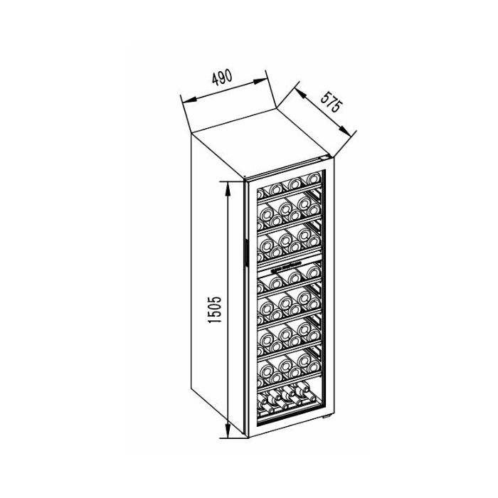 Kapacitet: 83 boce 2 zone (5°C-20 °C) Hlađenje crnog i bijelog vina Širina: 49 cm Visina: 150 cm Dubina: 57,5 cm Energetska klasa: G Klimatski razred: ST Potrošnja: 151 kWh/god Razina buke: 41 dB Težina: 52 kg Stakleni crni okvir oko vrata Kompresorsko hlađenje UV zaštitno staklo Zaštita boca od vibracija Bijelo LED unutarnje svjetlo LED display
