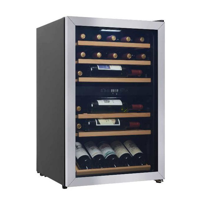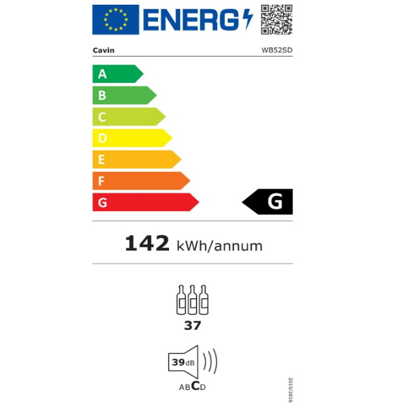 Cavin WB52SD Hladnjak za vino iz serije Polar Collection Hlađenje crnog i bijelog vina Inox okvir vrata Kompresorsko hlađenje UV zaštitno staklo Elektronske kontrole Bijelo LED unutarnje svjetlo Kapacitet: 37 boca Gornja zona hlađenja (4-12 °C) Donja zona hlađenja (12-22 °C) Širina: 54 cm Visina: 84,5 cm Dubina: 54,8 cm Energetska i klimatska klasa: G, N Potrošnja: 142 kWh/god Težina: 38 kg Razina buke: 39 dB