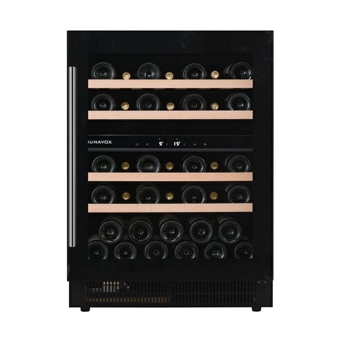 Dvozonski model za montažu ispod pulta kapaciteta 39 boca. Ima elegantnu vanjštinu i ručku na vratima od nehrđajućeg čelika. DUNAVOX Flow-39 savršen je za suvremena kuhinjska okruženja. Boce su postavljene na čvrste drvene police i okružene bijelom, jantarnom i plavom unutarnjom LED rasvjetom.