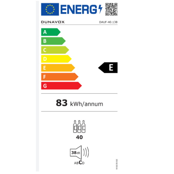 Kapacitet: 40 boca, 138 lit Jedna komora za hlađenje 5-20°C Inox ručka i inox okvir oko vrata Metalne police na izvlačenje Reverzibilna vrata Digitalni termostat Plavo, bijelo ili narančasto LED svjetlo Potrošnja: 138 kWh/god Energetska klasa: G Dimenzije (Š x V x D): 595 x 813 x 570 mm