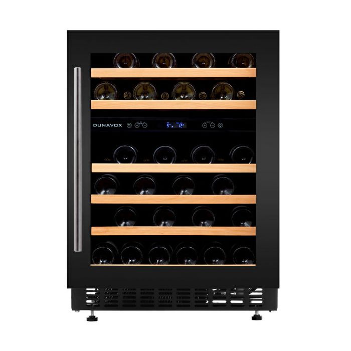 Dvozonski model za montažu ispod pulta kapaciteta 46 boca. Ima elegantnu vanjštinu i LCD zaslon. DUNAVOX Flow-46D savršen je za suvremena kuhinjska okruženja. Boce su oslonjene na teleskopske police okružene bijelom, jantarnom i plavom unutarnjom LED rasvjetom.
