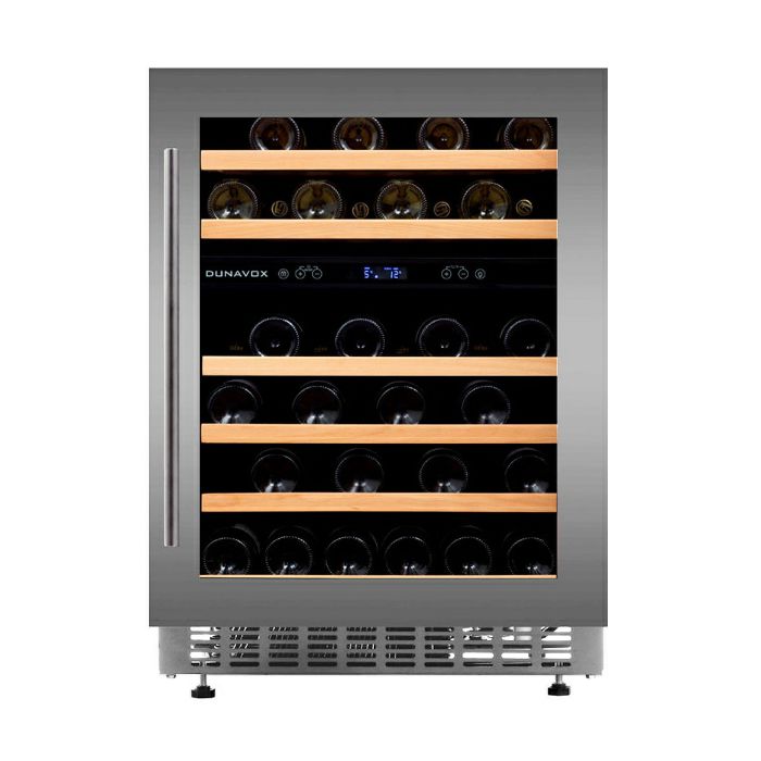 Dvozonski model za montažu ispod pulta kapaciteta 46 boca. Ima elegantnu vanjštinu i LCD zaslon. DUNAVOX Flow-46D savršen je za suvremena kuhinjska okruženja. Boce su oslonjene na teleskopske police okružene bijelom, jantarnom i plavom unutarnjom LED rasvjetom.