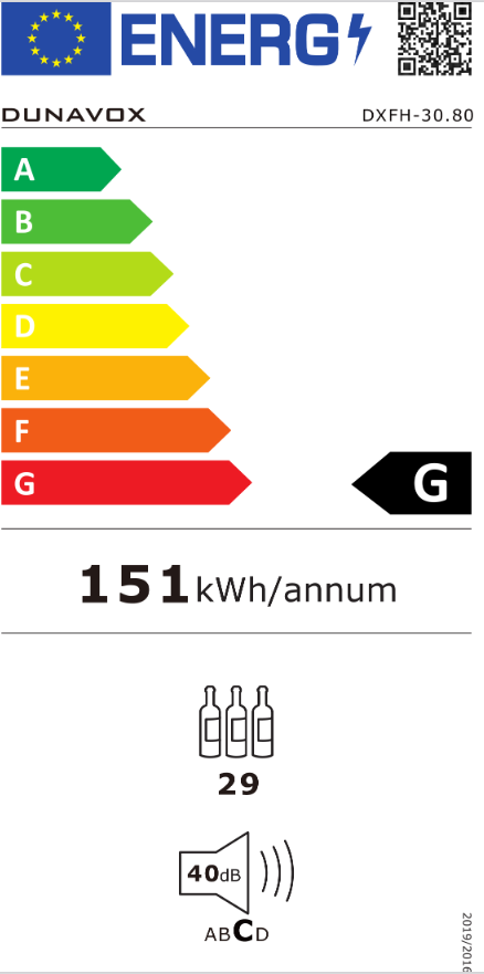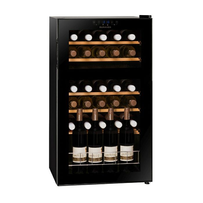 Dunavox DXFH-30.80 Dvozonski, model kapaciteta 29 boca Hladnjak ima udubljenu ručku na vratima, a boce se drže na čvrstim drvenim policama. Ovaj hladnjak podržava skladištenje otvorenih boca. Gornja zona mora biti hladnija od donje zone, temperaturna razlika između zona ne smije biti veća od 6°C. Ova jedinica nije prikladna za ugradnju u ili ispod pulta.