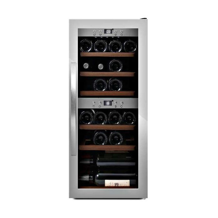 mQuvée WineExpert SW-24S Samostojeći hladnjak za vino Inox okvir oko vrata Hlađenje od 5 - 20 °C Kompresorsko hlađenje UV zaštitno staklo Zaštita boca od vibracija Automatsko odleđivanje Bijelo LED unutarnje svjetlo LED display Kapacitet: 24 boce 2 zone (5 - 20 °C) Inox ručka Hlađenje crnog i bijelog vina Š: 39,5 x V: 88 x D: 54 cm Energetska i klimatska klasa: G, ST Potrošnja: 135 KWh/god Nivo buke: 41 dB Težina: 34 kg