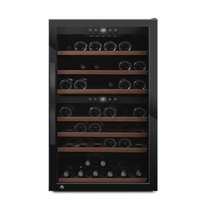 mQuvée WineExpert SW-66B Samostojeći hladnjak za vino Stakleni crni okvir oko vrata Hlađenje od 5 - 20 °C Kompresorsko hlađenje UV zaštitno staklo Zaštita boca od vibracija Automatsko odleđivanje Bijelo LED unutarnje svjetlo LED display Kapacitet: 66 boca 2 zone (5 - 20 °C) Crna ručka Hlađenje crnog i bijelog vina Š: 59,5 x V: 104 x D: 63 cm Energetska i klimatska klasa: G, ST Potrošnja: 165 KWh/god Nivo buke: 41 dB Težina: 53 kg
