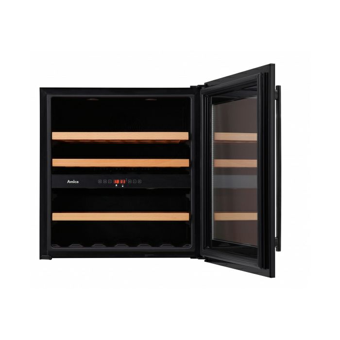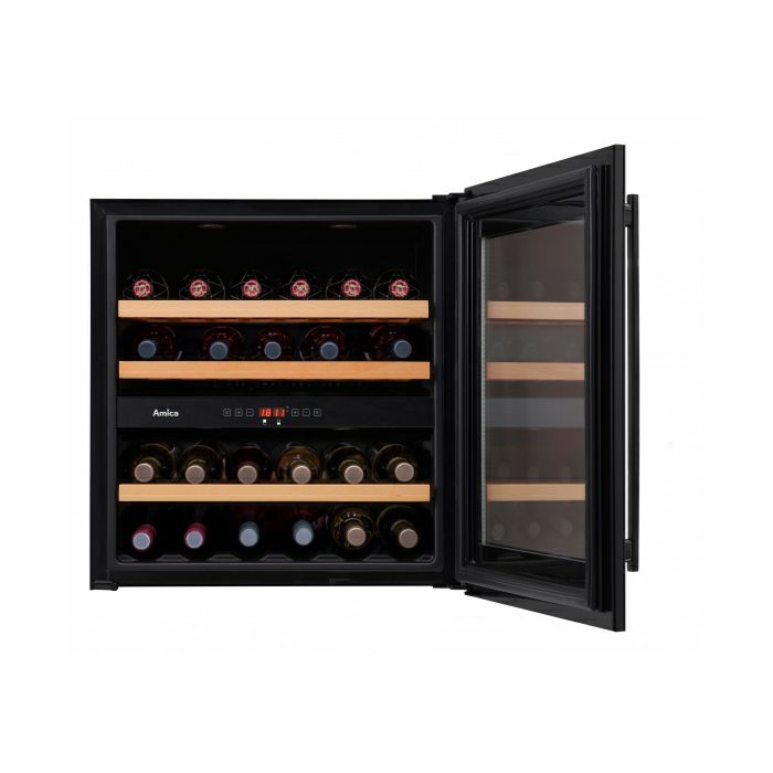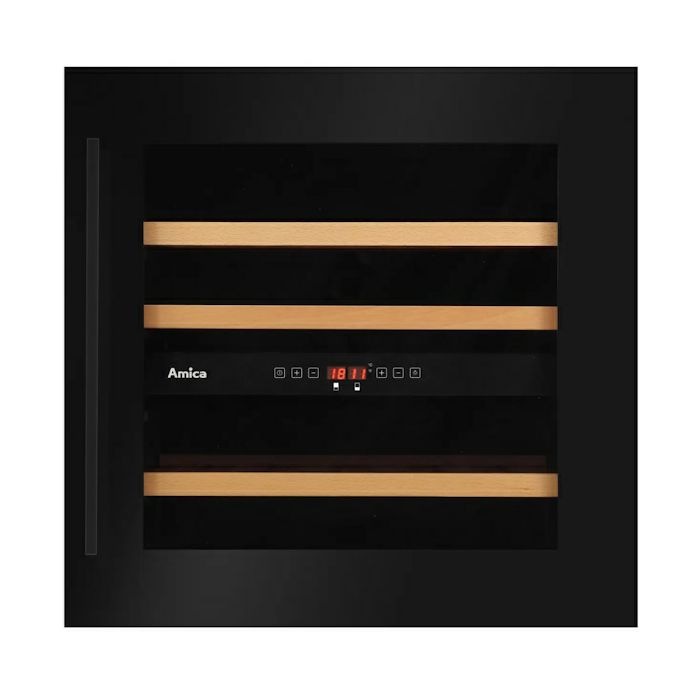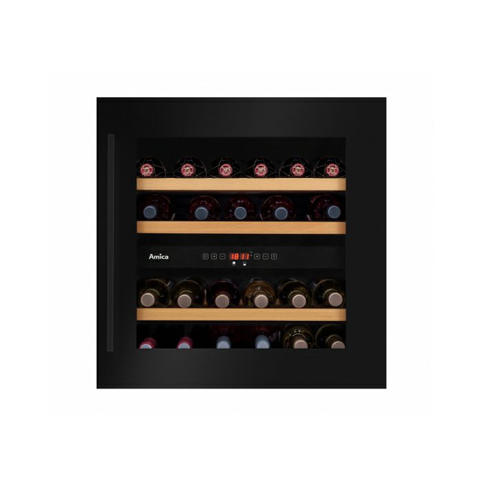 Kapacitet: 34 boca/75 lit Crna vrata Ugradbeni u element Reverzibilna vrata UV filler LED rasvjeta 2 zone Drvene police Temperatura: 5-20 °C Energetska klasa: G ST klimatska klasa Potrošnja: 140 kWh/god Dimenzije (cm): 59,5(v) x 59,5(š) x 51(d) Razina buke: 39dB