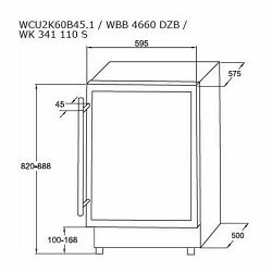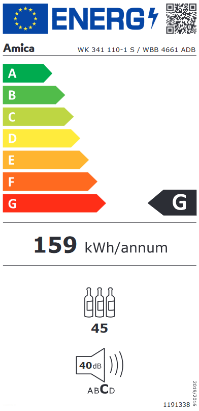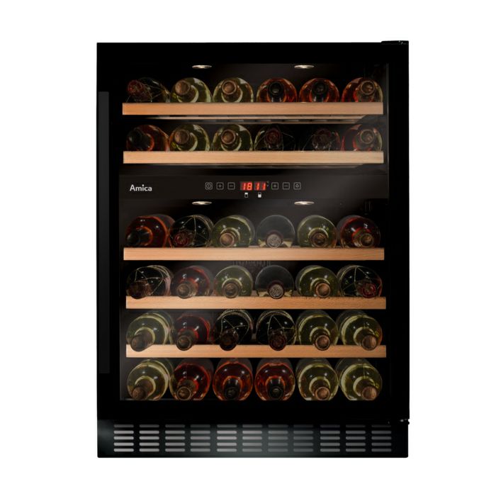 Amica WK 341 110-1 S Ugradbeni / podpultni hladnjak za vino Kapacitet: 45 boca / 125 lit. Crna vrata Reverzibilna vrata UV filler LED rasvjeta 2 zone Drvene police Gornja zona: 5-12 °C Donja zona: 12-20 °C Gornja zona: 15 boca Donja zona: 30 boca Ener.klasa: G Potrošnja: 180 kWh/god Dimenzije (cm): 82(v) x 59,5(š) x 60(d) Nivo buke: 39 dB