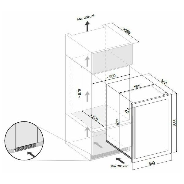 Unutar hladnjaka se nalaze drvene police. Model je predviđen samo kao ugradbeni. Unutarnje svjetlo je plave boje.br>