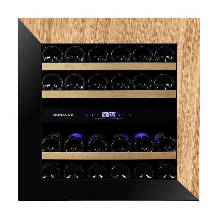 Dunavox DAVG-25.63DOP.TO Ugradbeni hladnjak za vino Kapacitet: 25 boca, 63 lit Dvije komore za hlađenje Crni / drvo okvir oko vrata - mogućnost instalacije odabranog dekora na pripremljen okvir hladnjaka Drvene police Reverzibilna vrata Digitalni termostat Plavo, bijelo ili crveno LED svjetlo Hlađenje od 5C-20C Potrošnja: 140 kWh/god Energetska klasa: G Razina buke: 39 dB Dimenzije: 59.5 cm x 59 cm x 56.3 cm