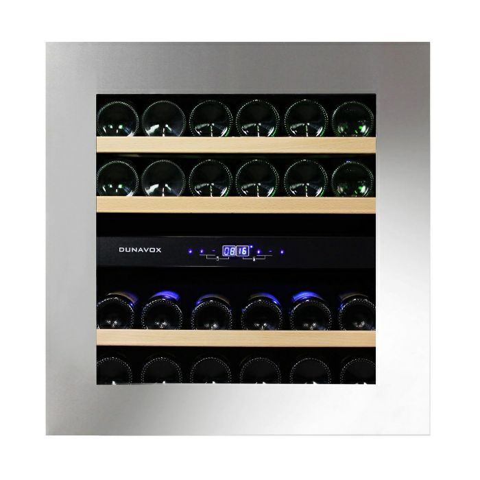 Dunavox DAVG-25.63DSS.TO Ugradbeni hladnjak za vino Kapacitet: 25 boca, 63 lit Dvije komore za hlađenje Staklena vrata Inox okvir oko vrata Drvene police Reverzibilna vrata Digitalni termostat Plavo, bijelo ili crveno LED svjetlo Hlađenje od 5C-20C Potrošnja: 140 kWh/god Energetska klasa: G Razina buke: 39 dB Dimenzije: 59.5 cm x 59 cm x 56.3 cm
