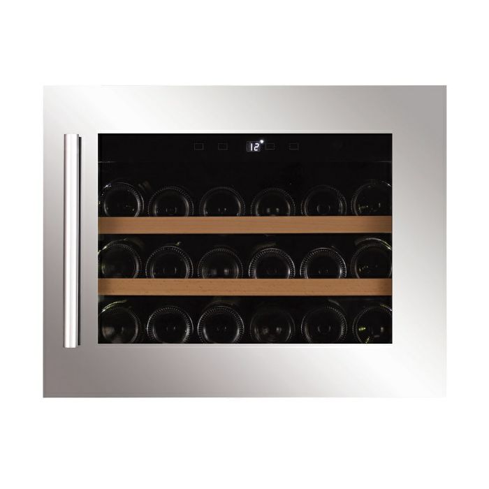Kapacitet: 18 boca, 46 lit Jedna komora za hlađenje Inox ručka Drvene police Reverzibilna vrata Digitalni termostat Plavo, bijelo ili narančasto LED svjetlo Hlađenje od 5C-20C Potrošnja: 140 kWh/god Energetska klasa: G Dimenzije: 45.5 x 59 x 54.5 cm Inox