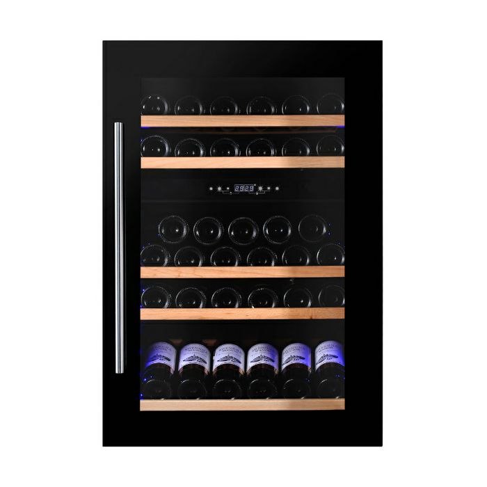 Kapacitet: 49 boca, 116 lit Dvije komore za hlađenje Zatamnjeno staklo Crni okvir oko vrata, inox ručka Drvene police Reverzibilna vrata Digitalni termostat LED svjetlo Hlađenje od: +5 C do +20 C Potrošnja struje: 195 kWh/god Energetska klasa: G Dimenzije: 885 x 590 x 545 mm