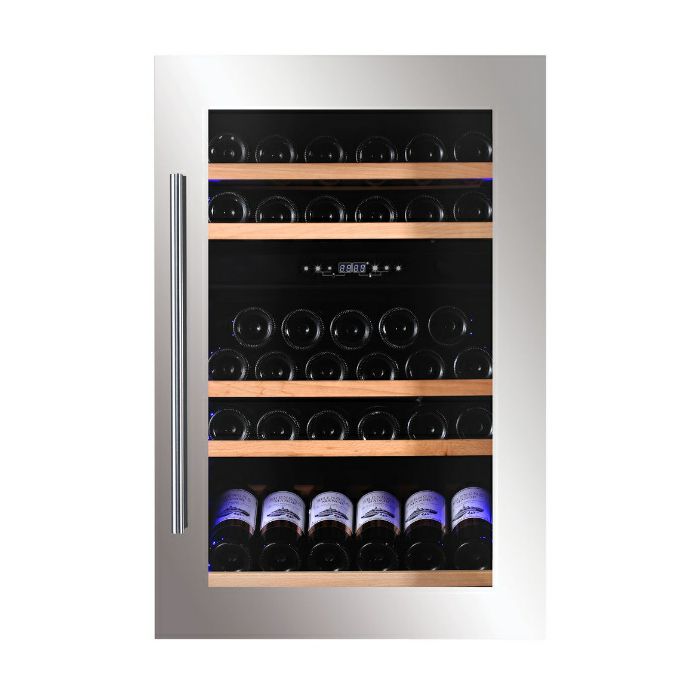 Kapacitet: 49 boca, 116 lit Dvije komore za hlađenje Zatamnjeno staklo Inox okvir oko vrata, inox ručka Drvene police Reverzibilna vrata Digitalni termostat LED svjetlo Hlađenje od: +5 C do +20 C Potrošnja struje: 195 kWh/god Energetska klasa: G Dimenzije: 885 x 590 x 545 mm