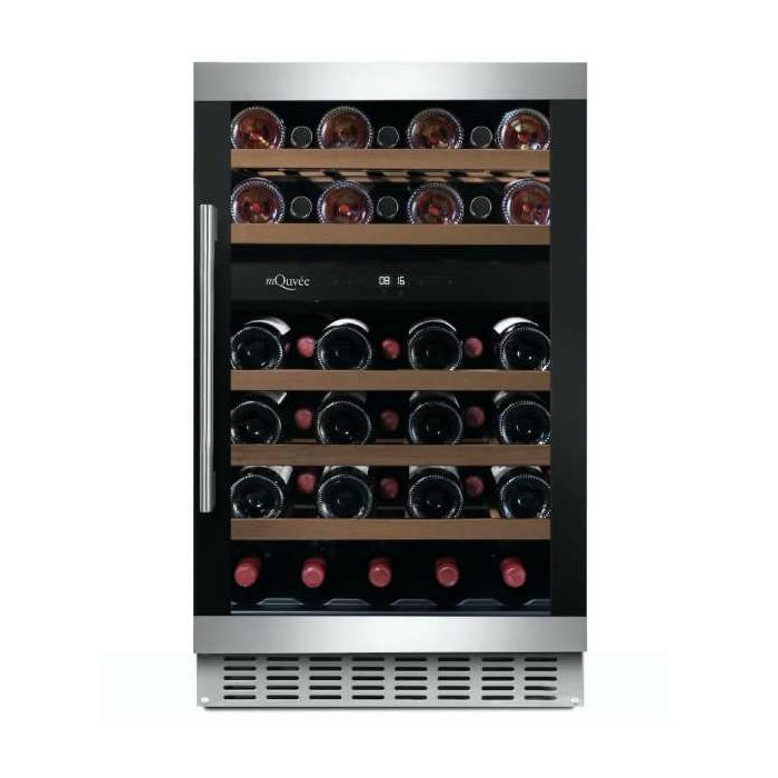 WineCave WCD50M Ugradbeni - podpultni hladnjak za vino Inox / staklo okvir vrata Kompresorsko hlađenje UV zaštitno staklo Zaštita boca od vibracija Ugljeni filter Reverzibilna vrata Automatsko odmrzavanje Podesive nogice - 7 cm Alarm visoke temperature i otvorenih vrata Bijelo LED unutarnje svjetlo LED display Visina vrata 70 cm Kapacitet 38 boca 2 zone (5-20 °C) Inox ručka Hlađenje crnog i bijelog vina Š: 49,5 x V: 82/89 x D: 57 cm Energetska i klimatska klasa: F, ST, SN Potrošnja: 149 kWh/god Težina: 43 kg Razina buke: 36 dB
