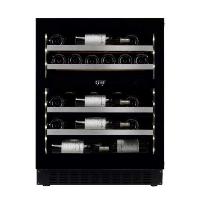 WineCave WCD60FGBP-700 Ugradbeni - podpultni hladnjak za vino Crni stakleni okvir vrata Kompresorsko hlađenje UV zaštitno staklo Zaštita boca od vibracija Ugljeni filter Reverzibilna vrata Automatsko odmrzavanje Podesive nogice - 7 cm Alarm visoke temperature i otvorenih vrata Bijelo LED unutarnje svjetlo LED display Visina vrata 70cm Kapacitet 31 boca 2 zone (5-20 °C) Touch open - bez ručke Hlađenje crnog i bijelog vina Š: 59,5 x V: 82/89 x D: 56 cm Energetska i klimatska klasa: F, ST, SN Potrošnja: 196 kWh/god Težina: 53 kg Razina buke: 36 dB