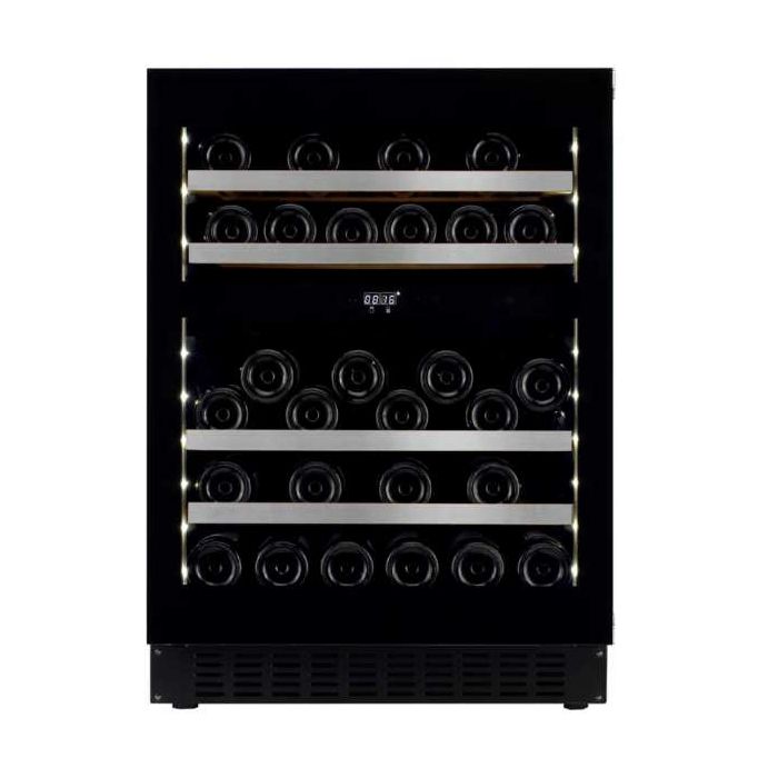 WineCave WCD60FGBP Ugradbeni - podpultni hladnjak za vino Crni stakleni okvir vrata Kompresorsko hlađenje UV zaštitno staklo Zaštita boca od vibracija Ugljeni filter Reverzibilna vrata Automatsko odmrzavanje Podesive nogice - 7 cm Alarm visoke temperature i otvorenih vrata Bijelo LED unutarnje svjetlo LED display Visina vrata 72 cm Kapacitet 45 boca 2 zone (5-20 °C) Touch open - bez ručke Hlađenje crnog i bijelog vina Š: 59,5 x V: 82/89 x D: 56 cm Energetska i klimatska klasa: F, ST, SN Potrošnja: 103 kWh/god Težina: 50 kg Razina buke: 36 dB