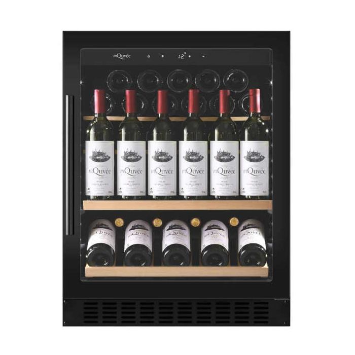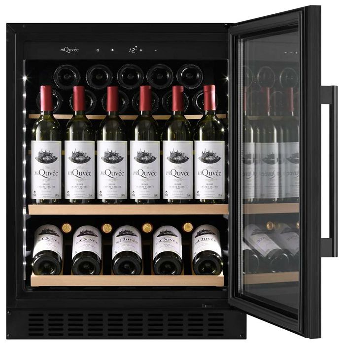 mQuvée WineCave WCS60ABPS-700 Hladnjak za vino ugradbeni Kapacitet 36 boca 1 zona (5-20 °C) Crna ručka i okvir oko vrata Posebne police za pjenušce Š: 59,5 x V: 82/89 x D: 57 cm Hlađenje crnog ili bijelog vina Energetska klasa: F Klimatski razred: ST-SN Potrošnja: 104 KWh/god Težina: 44 kg Nivo buke: 36 dB Poseban tihi mod rada Poseban mod za održavanje vlage i temperature Kompresorsko hlađenje UV zaštitno staklo Zaštita boca od vibracija Ugljeni filter Reverzibilna vrata Automatsko odmrzavanje Podesive nogice – 7 cm Alarm temperature i vrata Bijelo LED unutarnje svjetlo LED display Visina vrata 70 cm