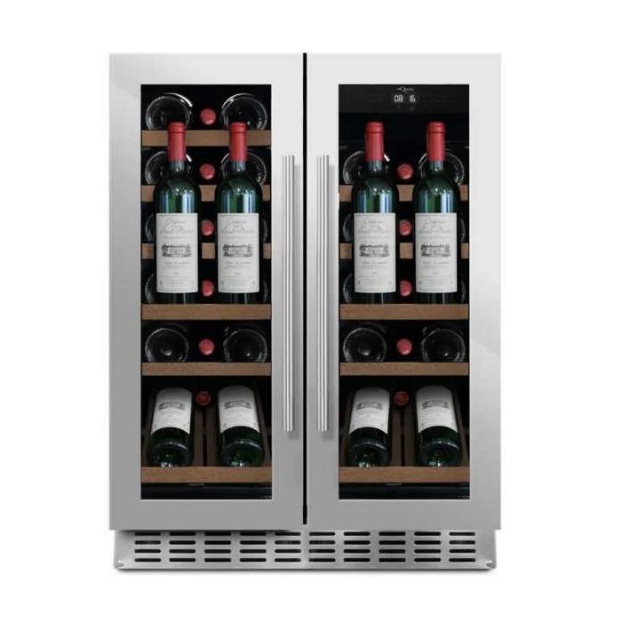 WineCave WE2D60S Ugradbeni - podpultni hladnjak za vino Inox okvir vrata Kompresorsko hlađenje UV zaštitno staklo Zaštita boca od vibracija Ugljeni filter Reverzibilna vrata Automatsko odmrzavanje Podesive nogice - 7 cm Alarm visoke temperature i otvorenih vrata Bijelo LED unutarnje svjetlo LED display Visina vrata 72 cm Kapacitet 42 boce 2 zone (5-20 °C) Inox ručke Hlađenje crnog i bijelog vina Š: 59,5 x V: 82/89 x D: 56 cm Energetska i klimatska klasa: G, ST, SN Potrošnja: 147 kWh/god Težina: 49 kg Razina buke: 40 dB
