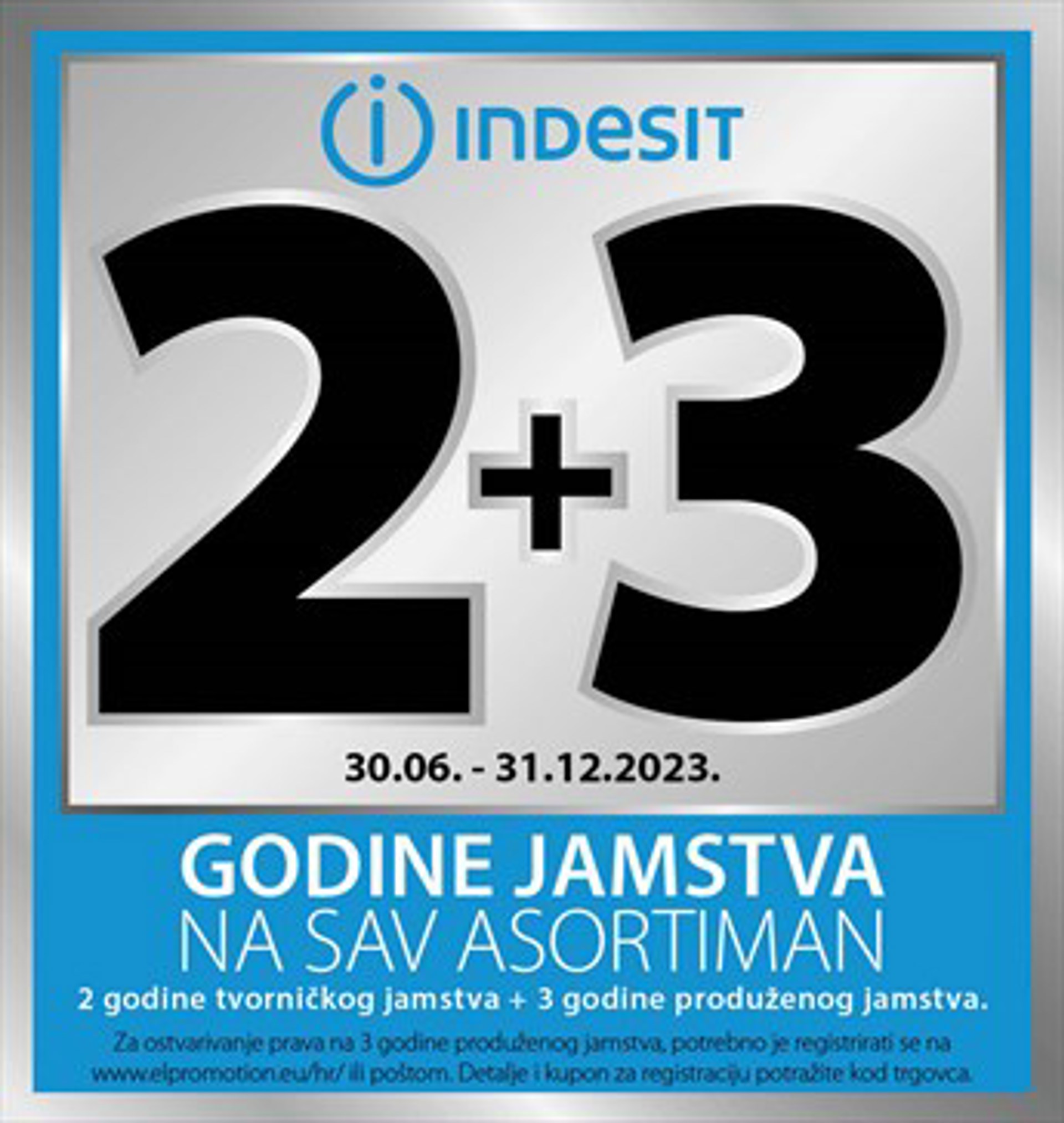 Kupnjom bilo kojeg uređaja iz Indesit asortimana, svaki kupac, uz 2 godine tvorničkog jamstva, ostvaruje pravo na 3 godine produženog jamstva.