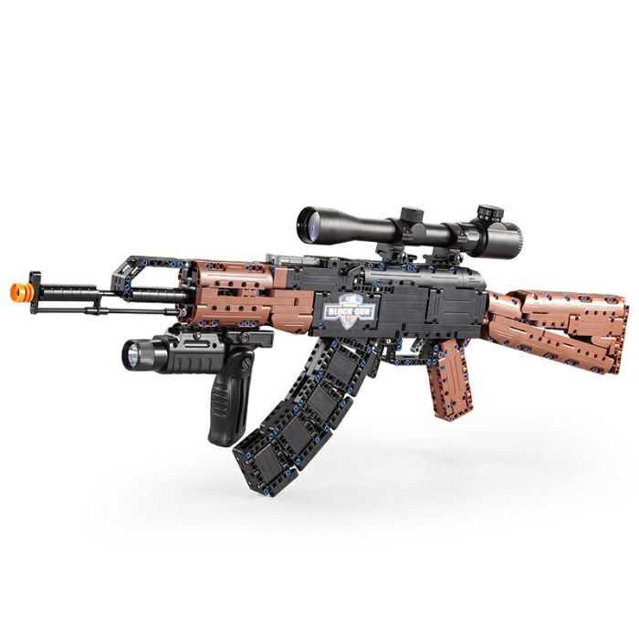 Impresivni model AK-47 izrađen od 738+ dijelova s bogatim mehaničkim funkcijama i dodacima: elektronički holografski nišan, taktički remen 98K i mogućnost "DIY" nadogradnji s raznim dodacima (nišan, vertikalna ručka, dvonožac/tronožac, svjetiljka). Idealno za izložbe i tematske kolekcije. To je model napravljen od kockica, a ne pravo oružje.