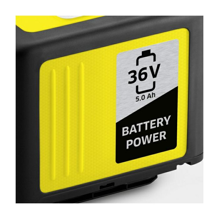 Kärcher izmjenjiva baterija od 36 V / 5,0 Ah može se koristiti u svim uređajima na platformi Kärcher 36 V baterija. Ovo štedi kupnju dodatnih baterija. Samopražnjenje akumulatora i gubitak kapaciteta zbog čestog djelomičnog pražnjenja (efekt memorije) su stvar prošlosti. Inovativna tehnologija u stvarnom vremenu s ugrađenim LCD zaslonom na prvi pogled prikazuje preostalo vrijeme rada, razinu napunjenosti i kapacitet baterije. Zahvaljujući ugodnim mekim elementima kućišta, baterija ne klizi čak ni na glatkim ili nagnutim površinama.