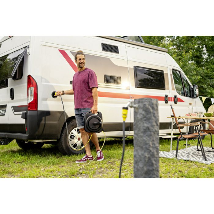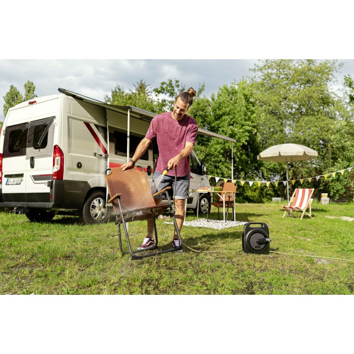 HBX 2.10 Hose Box je idealno rješenje za zalijevanje biljaka na balkonima, krovnim terasama iu malim vrtovima ili za korištenje na kampiranju. Kutija se isporučuje spremna za upotrebu, sa svim potrebnim priborom za vanjsku upotrebu uključenim u opseg isporuke. Crijevo se može brzo i bez napora namotati pomoću sklopive ručke. Osim toga, pouzdan sustav protiv kapanja s dva Aqua Stop priključka čini odspajanje jednostavnim i bez prskanja. Ovo, u kombinaciji s inteligentnim konceptom skladištenja pribora i crijeva za opuštanje, osigurava da vodeni tragovi na tepisima ili parketu postanu stvar prošlosti. Kompaktne proporcije znače da sanduk možete pohraniti u najuže prostore u zatvorenom prostoru, primjerice u ormariću ispod kuhinjskog sudopera. Druga mogućnost je montirati sanduk na zid. Držač crijeva također je prikladan kao dovodno crijevo za Kärcher K 2–K 4 visokotlačne čistače.