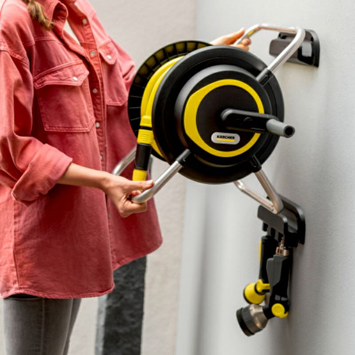 Jedinstvena praktičnost. Dvostruka funkcionalnost. Ovaj kolut za crijevo koristi se i za zidno skladištenje crijeva i za mobilnu upotrebu u vrtu. Mlaznice i cijevi za prskanje mogu se objesiti na zidni nosač i uvijek su spremne. HR 4 se jednostavno skida s držača i udoban je za nošenje zahvaljujući ergonomskoj ručki. Uz pomoć drške, koja se slobodno pomiče, možete bez napora smotati vrtno crijevo i spremiti ga uredno i pažljivo, bez savijanja ili dosadnog petljanja. Proizvod također osvaja bodove za svoj kompaktni dizajn i visoku stabilnost zbog niskog težišta. Kolut za crijevo je potpuno sastavljen i spreman za trenutnu upotrebu. Uređaj je također otporan na UV zrake i mraz, što ga čini dugotrajnim i dovoljno robusnim da izdrži svakodnevnu upotrebu. Kärcher nudi 5 godina jamstva.