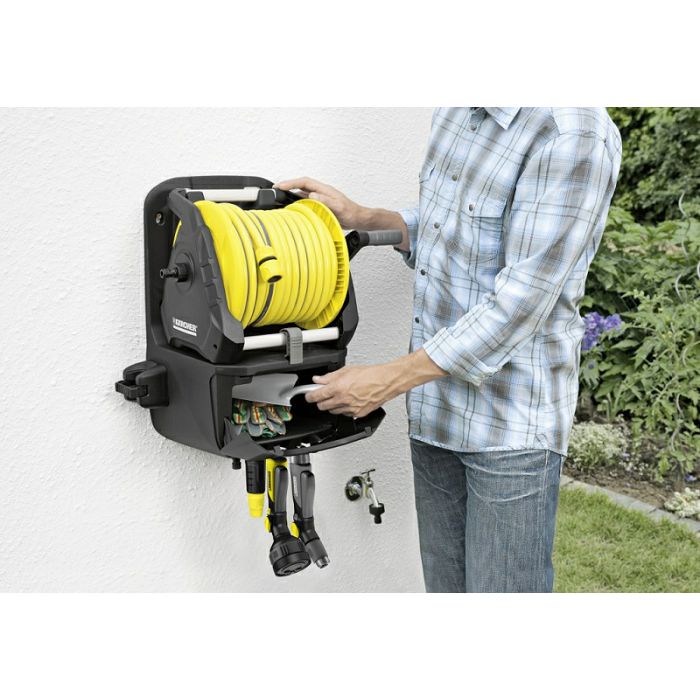 Kompaktna stanica za navodnjavanje! Kada se isporuči, Premium HR.7315 Kit 1/2" držač crijeva za mobilnu ili stacionarnu upotrebu savršen je za zalijevanje malih do srednjih površina i vrtova. Zahvaljujući brojnim mogućnostima pohranjivanja, konačno je sve na svom mjestu. Detalji opreme: odvojivi bubanj za crijevo (2 u 1), mogućnost spremanja dodataka za prskanje, prostrani pretinac za vrtne rukavice, škare, lopate. Uključuje zidni nosač, crijevo PrimoFlex® od 15 m 1/2", mlaznicu za prskanje Plus (2.645-177), 3 x standardnu spojnicu za crijevo, 1 x standardnu spojku za crijevo s Aqua Stopom, priključak za slavinu G3/4" i reduktor G1/2 , te dodatna mogućnost pričvršćivanja kanti za zalijevanje, jer zalijevanje s Kärcherom je pametno zalijevanje.
