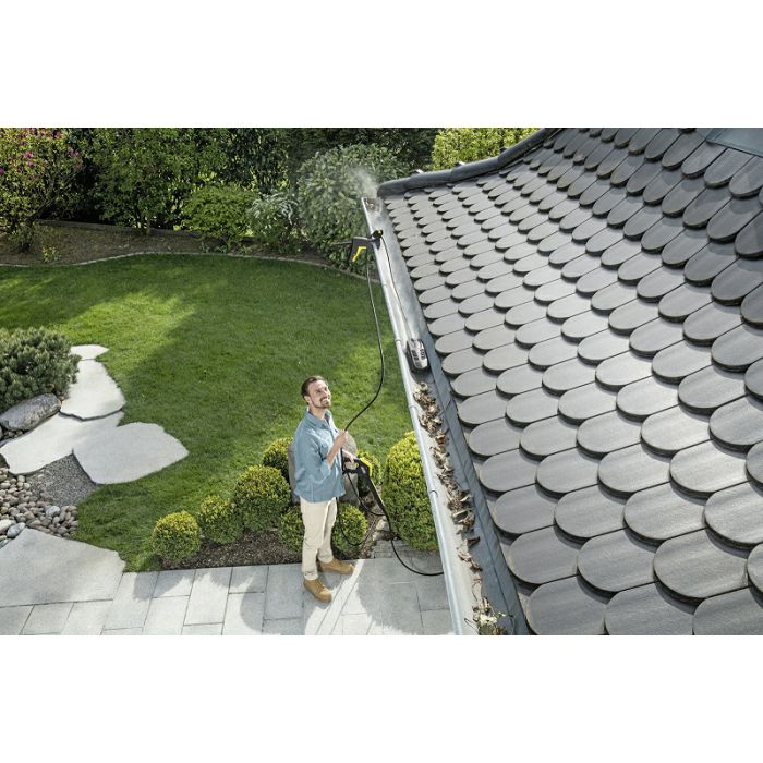 Pametno 2-u-1 rješenje za čišćenje krovnih oluka i začepljenih cijevi ili odvodi. Inovativni Kärcherov set za čišćenje krovnih oluka i cijevi radi potpuno sam - s visokim pritiskom. Cijev se samostalno kreće klizeći kroz krovni oluk, tako da penjanje po ljestvama do oluka nije potrebno. Komplet za čišćenje oluka i cijevi dolazi s dvije različite mlaznice: mlaznicom za čišćenje cijevi s četiri visokotlačna mlaza okrenuta prema natrag i mlaznicom za čišćenje krovnih oluka za montažu cijevi na nosač. Moguća je brza promjena između dvije različite mlaznice. Zaštita od savijanja i mesingani spoj osiguravaju dug život. Duljina cijevi je 20 m. Set za čišćenje krovnih oluka i cijevi prikladan je za Kärcher visokotlačne čistače klase K2 - K7.